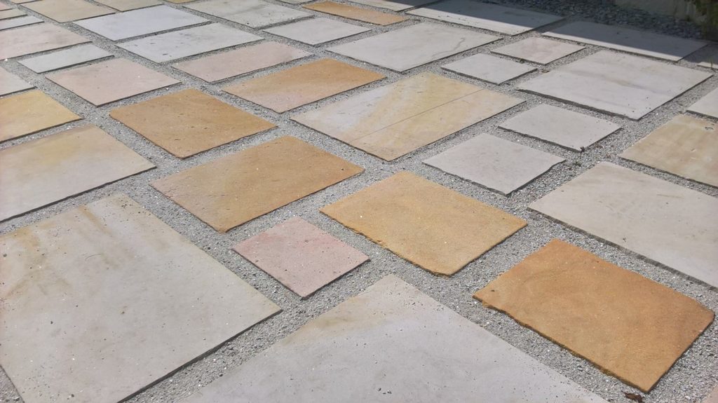 Polecamy na tarasy, patia, chodniki, ścieżki płyty z piaskowca zarówno przetworzone (lico: piaskowane, szlifowane, krawędzie: łamane – nie cięte! lub łupane) w różnych kolorach.